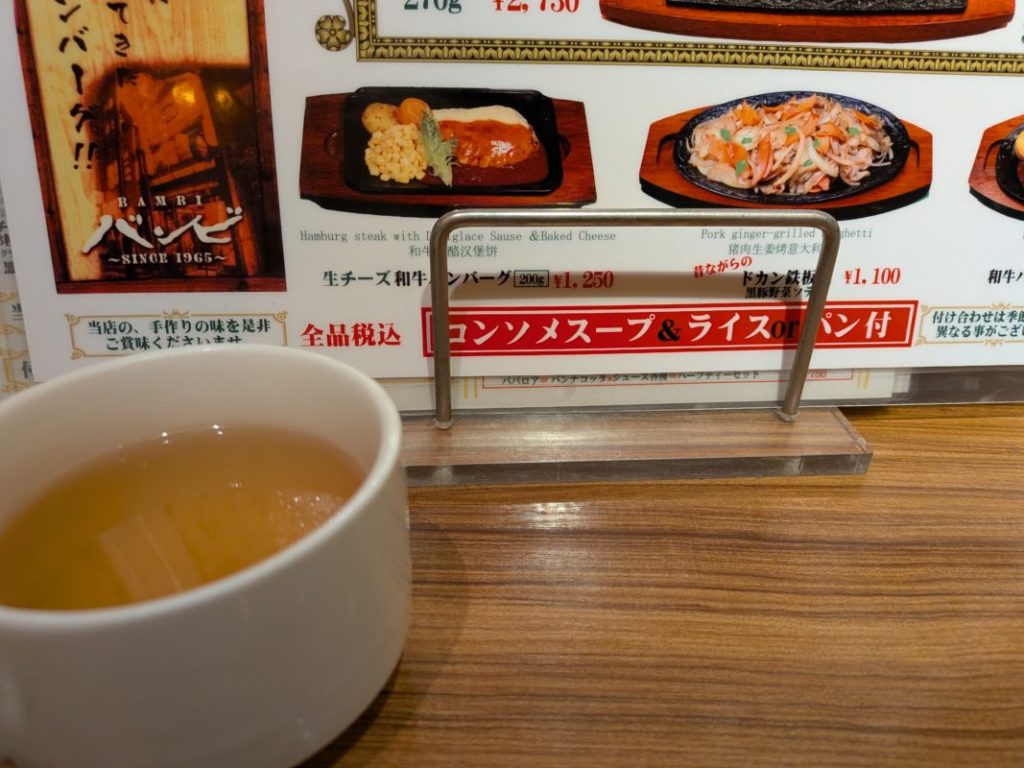 久々にバンビ。この「コンソメスープ&ライスorパン付」は、andとorがどこで区切れているのか分かりづらい