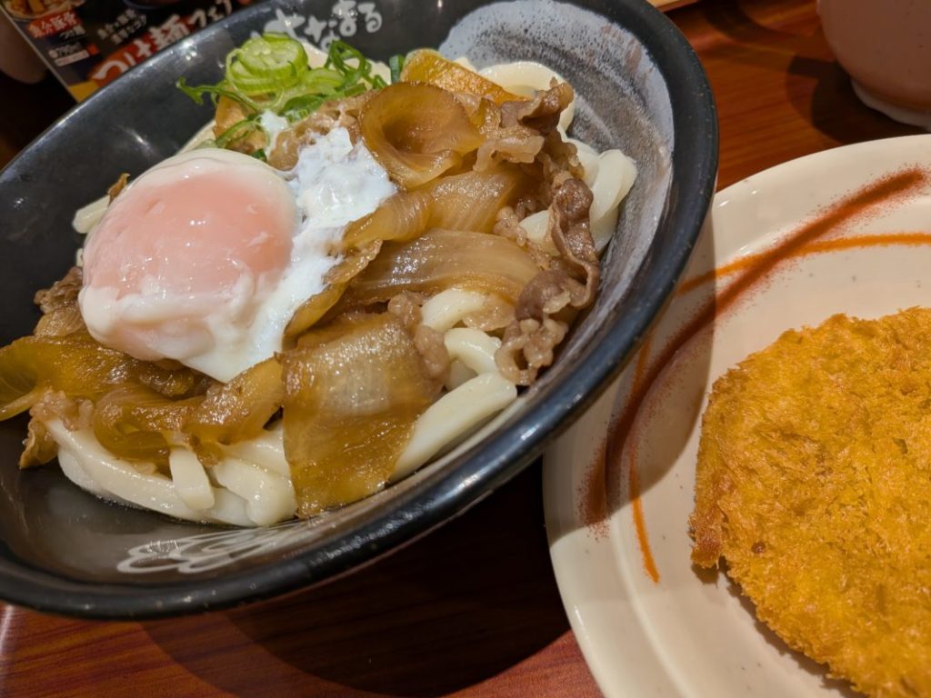 予定より早く終わり、最近できたはなまるうどんで肉のせナントカうどんにコロッケ追加、これくらいで1,300円程する