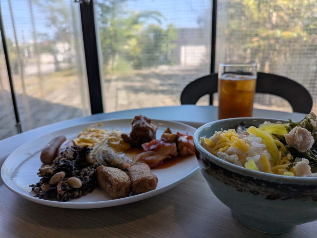 今日は朝イチでひと現場終わってからホテルに戻り朝食の流れ、天気が良いのでテラス席で食べている