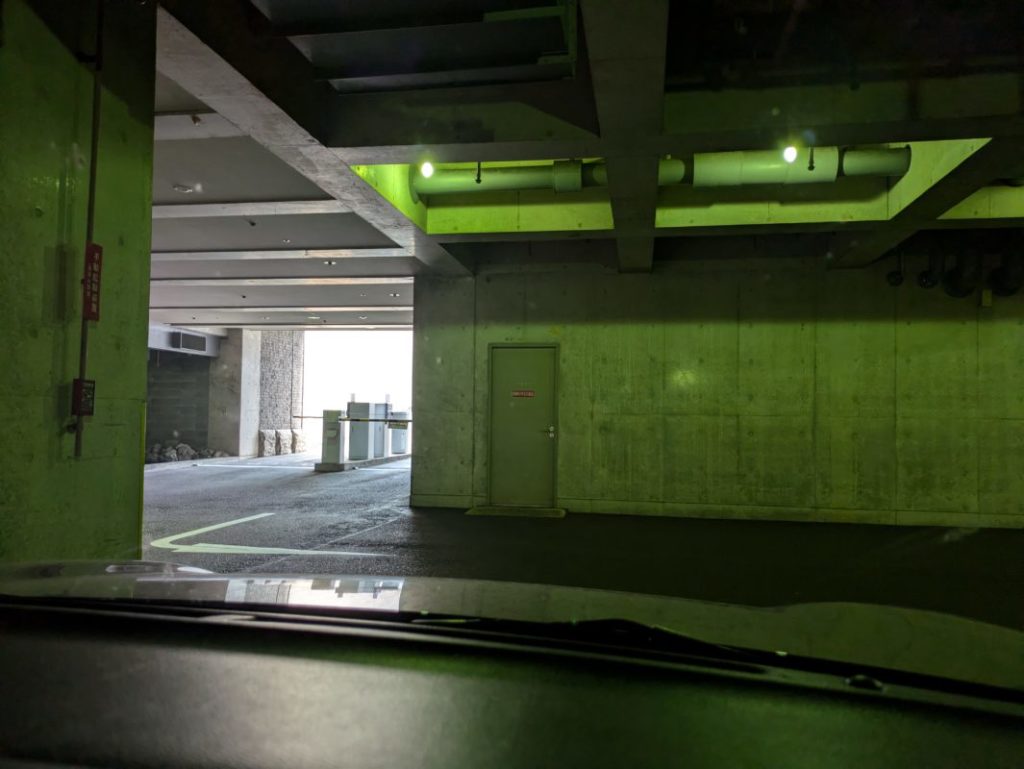 県図書ではいつも地下駐車場の出入り口付近に駐めている。奥の方に行くとスマホの電波が届かない。いつもここに駐めて、5分前になったら地下の出入り口ではなくて、そのゲートのところから外に出て正面玄関に並ぶ。開くのは地下も正面も同時だけど、地下から受付まで距離があっていつもの席が取れないと困るから。