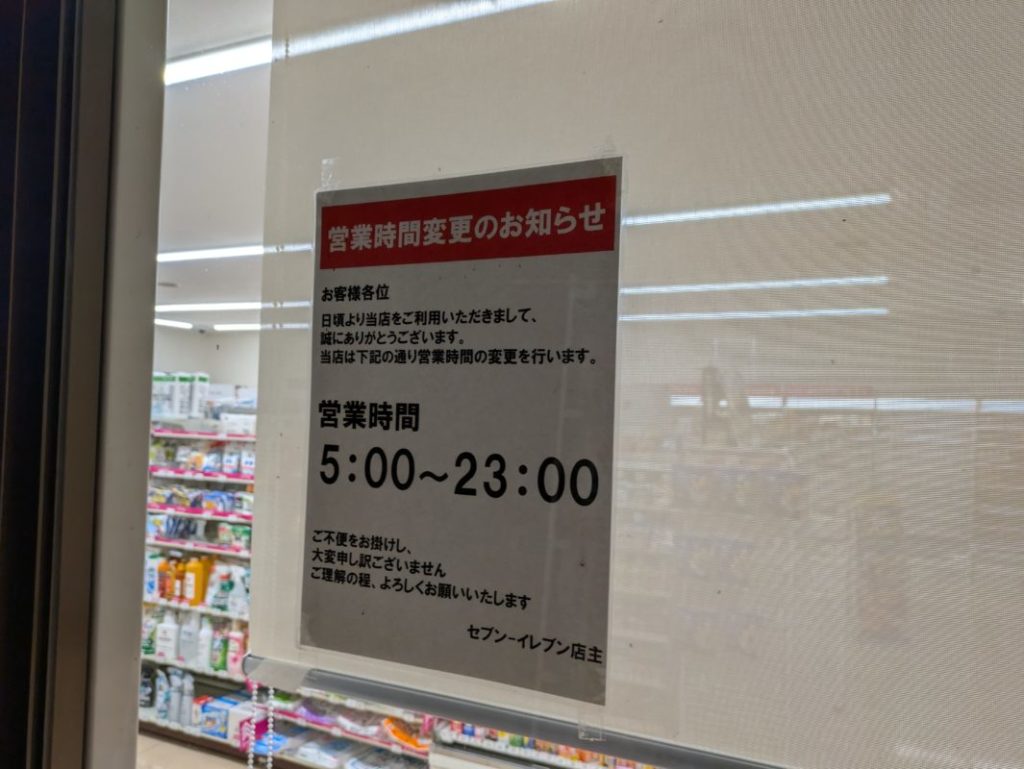 セブンに寄ったら24時間営業じゃなくなってた。まぁ別に良いと思う。