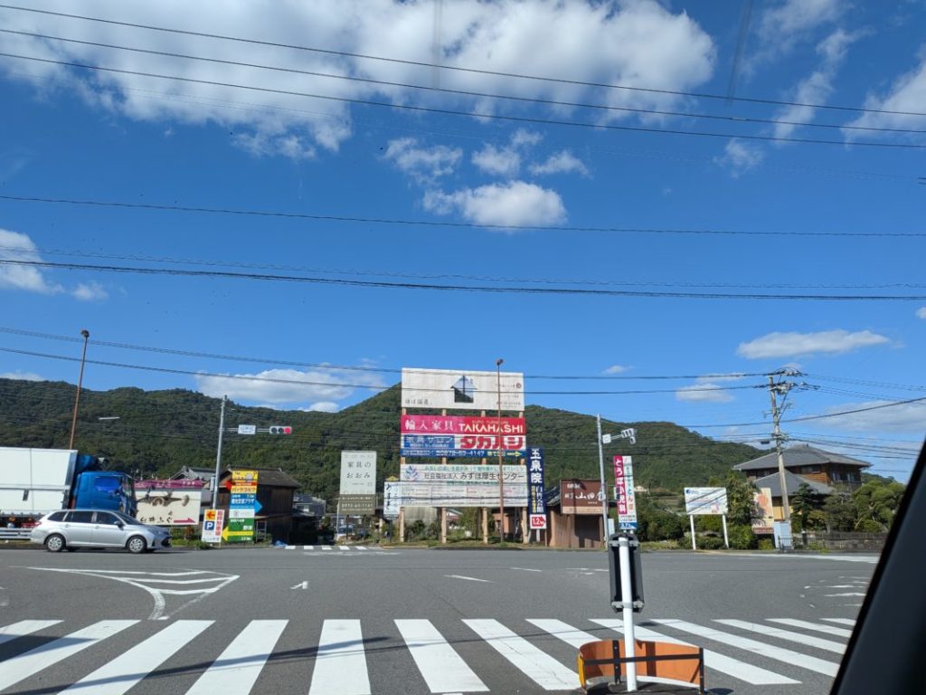 臼杵インター降りたところの看板、写真だとちょっと見づらいけど一番上のやつ、家の形に切り抜かれててその向こうの山がその中に見えるという、国産木材を使ってますというメッセージ。