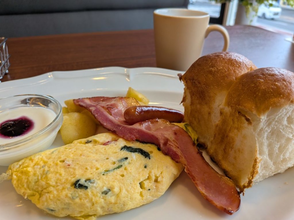 念願の?ロイホモーニングに来た。これは野菜オムレツ+英国風ブレッド。ちゃんと美味しいしコーヒーも飲み放題としては普通にアリ。席がゆったりしているし快適に過ごせる。Wi-Fiが無いけどまぁって感じかな