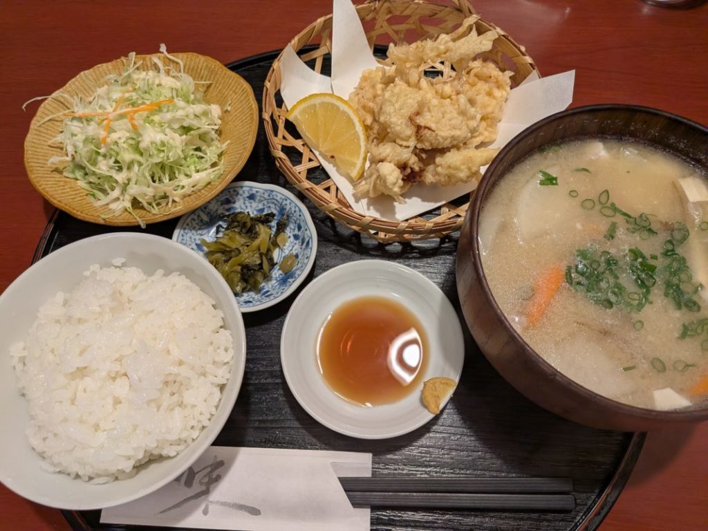 なんか観光客メニュー(とり天だんご汁定食)みたいなの食べてるw