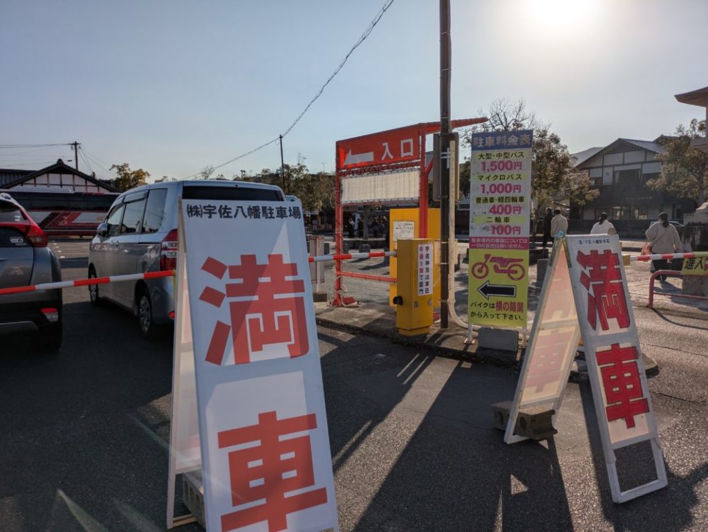 宇佐神宮って駐車場が全然足りないんだよな、10号線いつも手前と奥で2kmくらい渋滞してる。ただ足りないのは正月だけで他の日はむしろ閑古鳥なので広げるつもりも無いんだろう。俺ら地元民は小学校に駐めて(アナウンスされてないから駐車場になってることを余所の人は知らない)割と楽に参拝できて「あー混んでるね」と眺めながら向かう