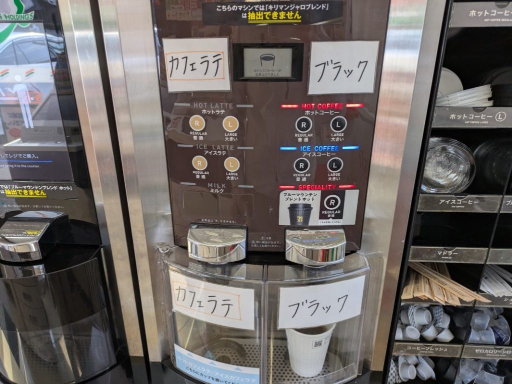 このコーヒーマシン、張り紙がたくさんあるなぁ(写真の上にもペタペタあった)・・・と気を取られていたら、ラージを買ったのにレギュラーのボタンを押してしまった><。そして「ボタンの押し間違いは対応しません」という張り紙もあったw 財布を届けたのに神様ひどい。
