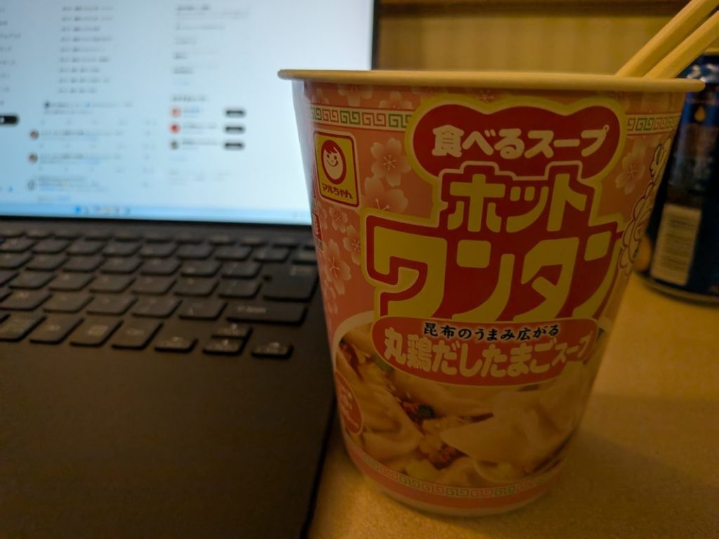 界隈の飲み会に参加し「選挙とSEO」というテーマで150秒ほどしゃべったところかなりウケたw 「面白かったです!」と話しかけてくれる人がたくさんいてこっちが驚いた。ケータリングを食べる暇がほぼ無かったので帰ってワンタン食べてるとこ